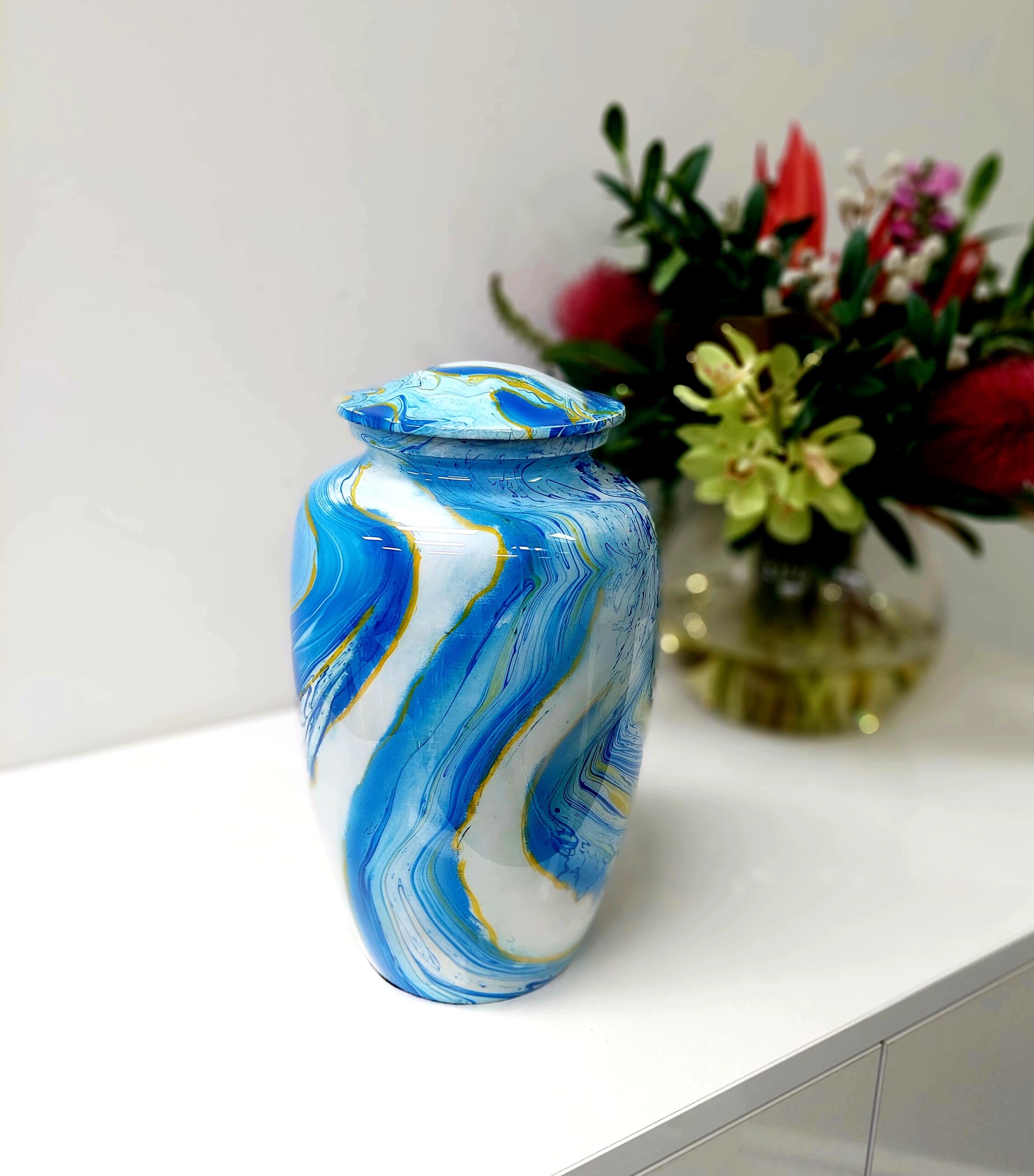 The Amalfi Coast Urn is vibrant with blue, white and a hint of yellow swirls. With a coastal vibe, it has a modern abstract pattern.