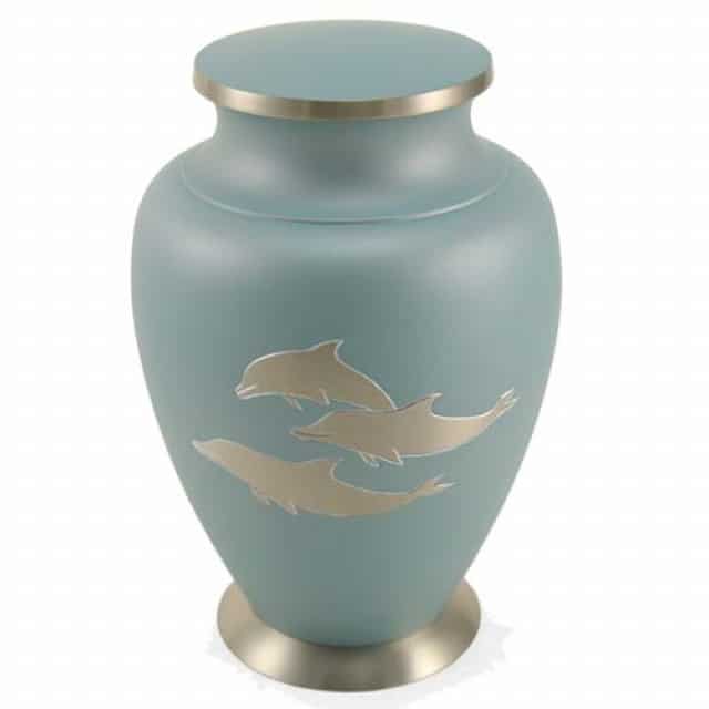 The Aria Dolphin Large Urn is a light, sea blue colour with three frolicking dolphins.