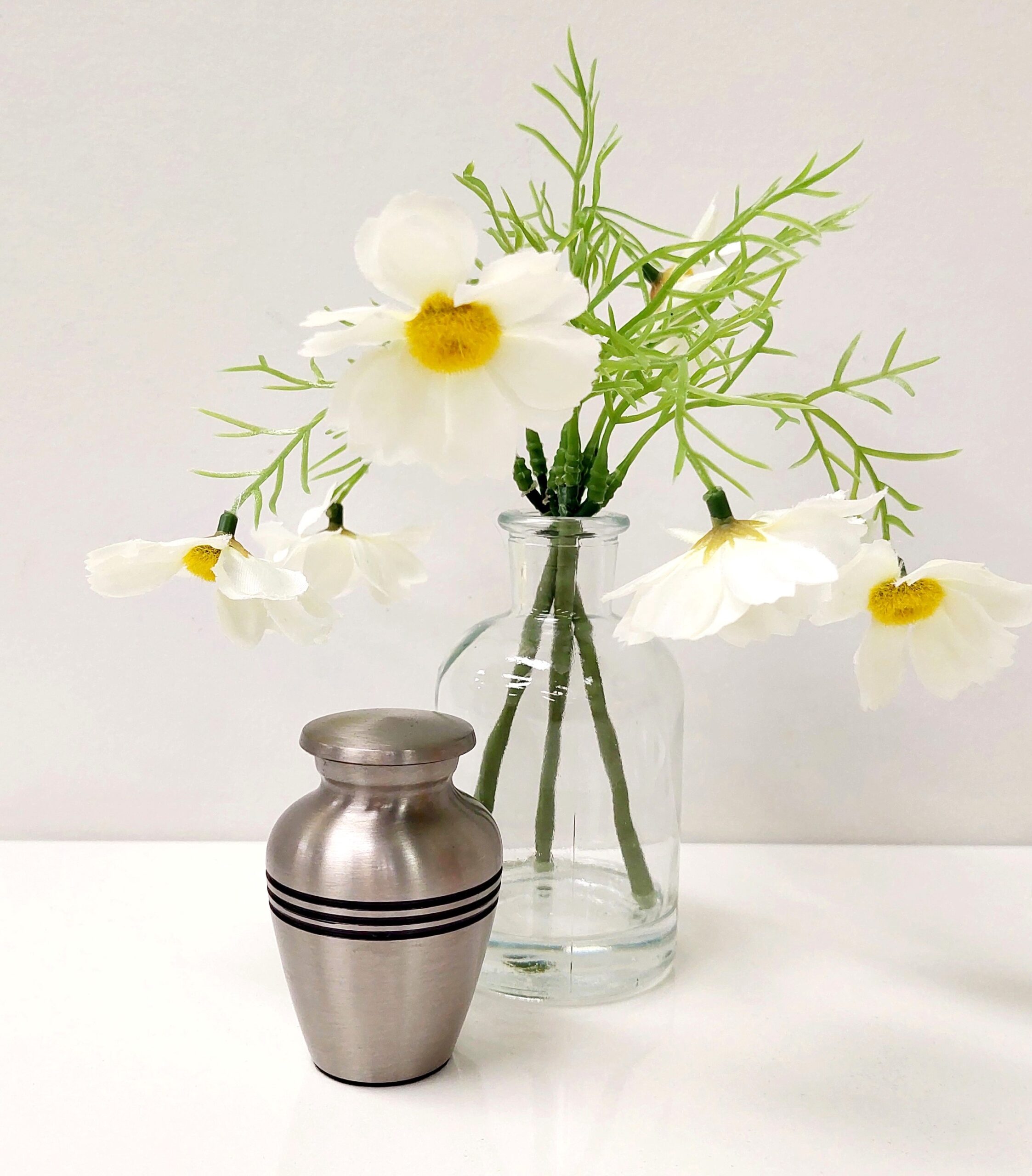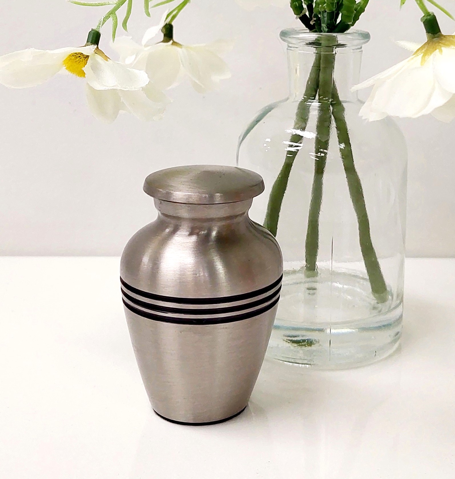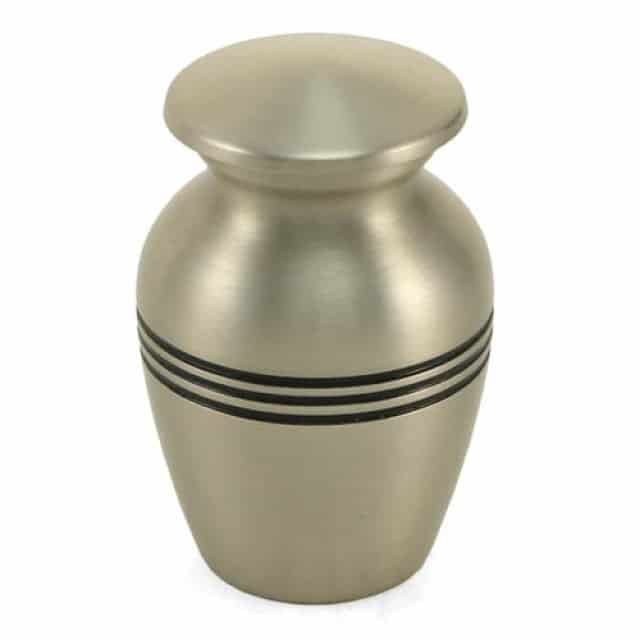 This small urn is made out of sturdy and durable brass, with a silver/pewter finish. Simple in style with three black lines etched into the brass urn, finished in black paint.