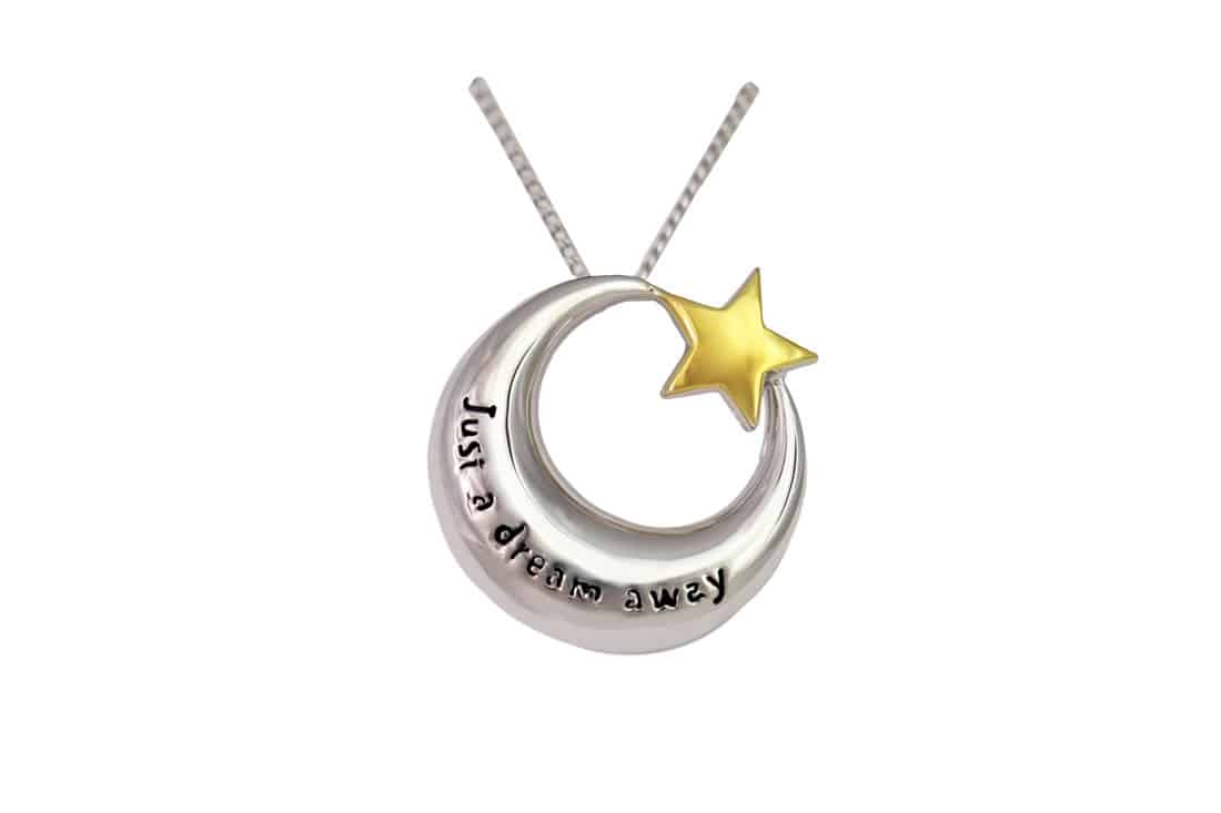 Engraved on the front this crescent moon shaped pendant is the phrase “Just a dream away”. A lovely sentiment and the moon is held together by a gold coloured star.