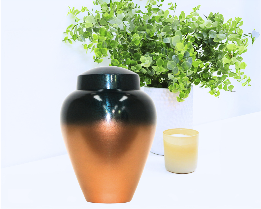 The Oceanic two-toned sea vibe urn has an emerald/black crackle effect top with a metallic bronze base.