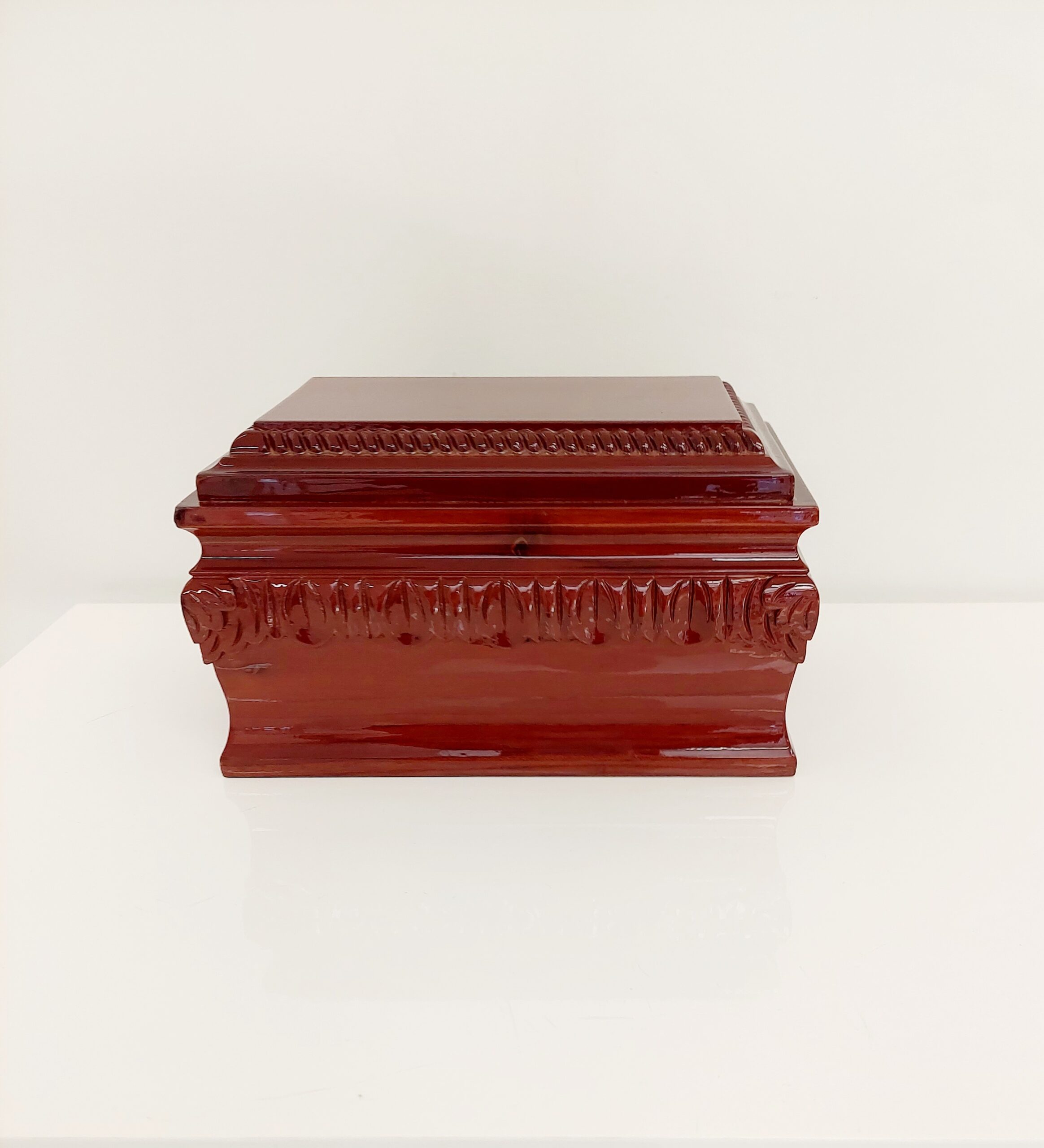 The Ornate Timber Box – Medium has a beautiful glossy vanish and is decorative in it’s craving.