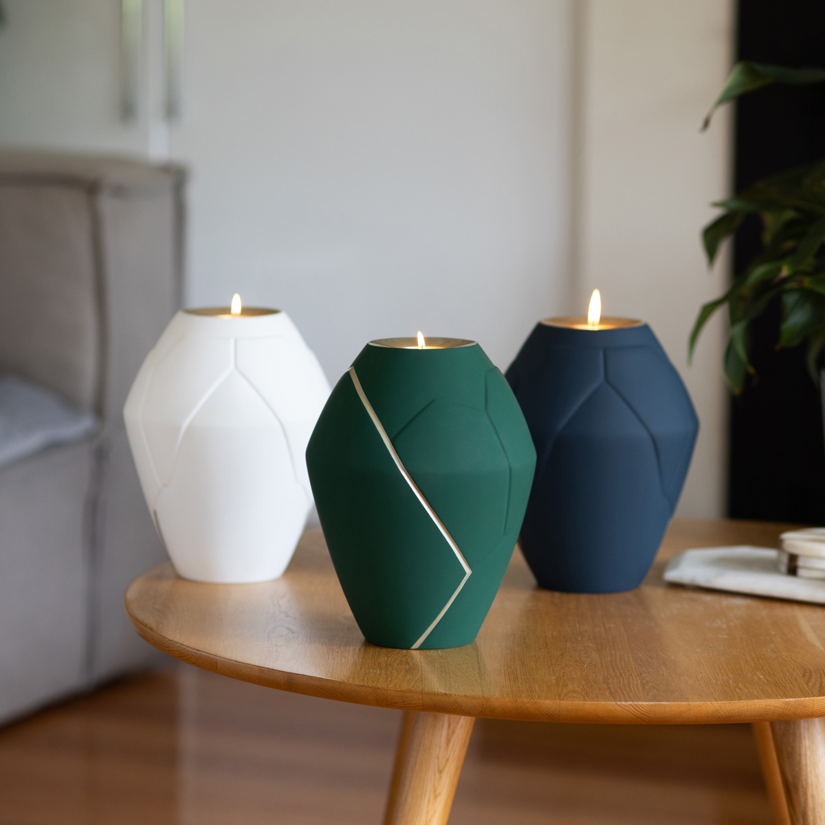 The Signature Series Navy Urn has light gold accents. This full size urn has a small capsule inside the bottom of the urn for either a keepsake item or a proximity beacon.