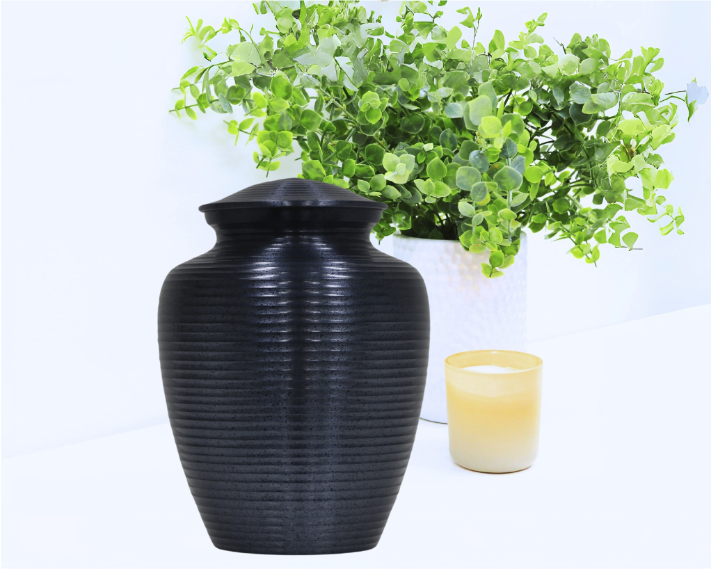 The Steel Grey Adult urn has a ridged and textured surface with a grey stone flecked pattern.